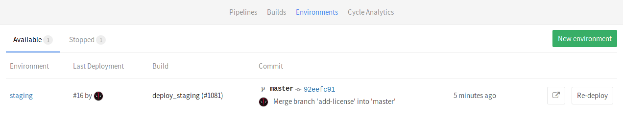 GitLab keeps track of your deployments, so you always know what is currently being deployed on your servers. That way you can have the full history of your deployments per every environment right in your browser. Clicking on an environment will show the history of its deployments. Assuming you have deployed multiple times already, here's how a specific environment's page looks like.