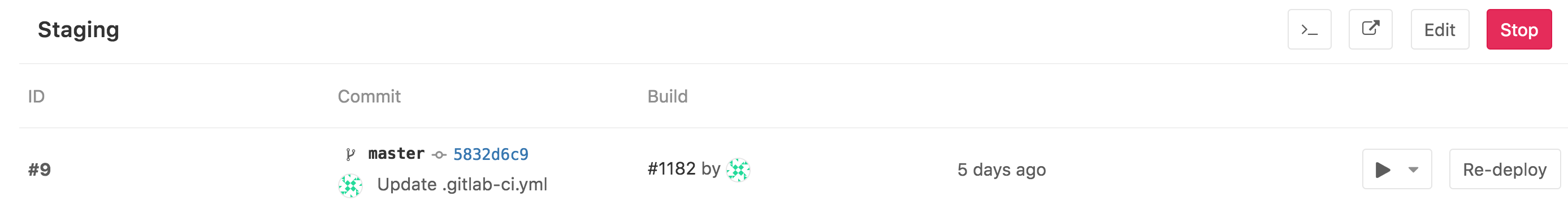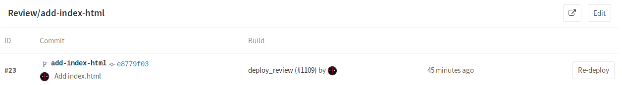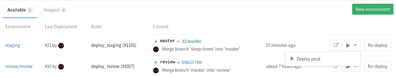 - A button that re-deploys the latest deployment, meaning it runs the job defined by the environment name for that specific commit