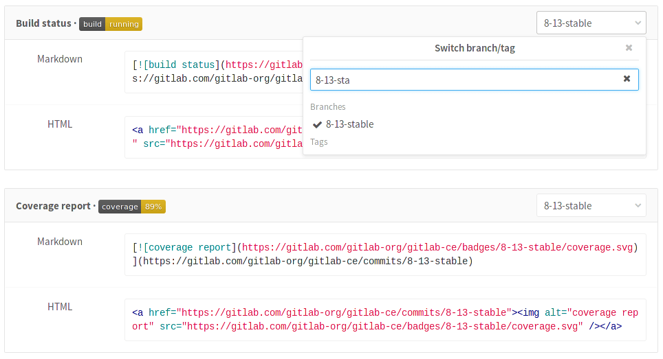 In the pipelines settings page you can find pipeline status and test coverage badges for your project. The latest successful pipeline will be used to read the pipeline status and test coverage values.