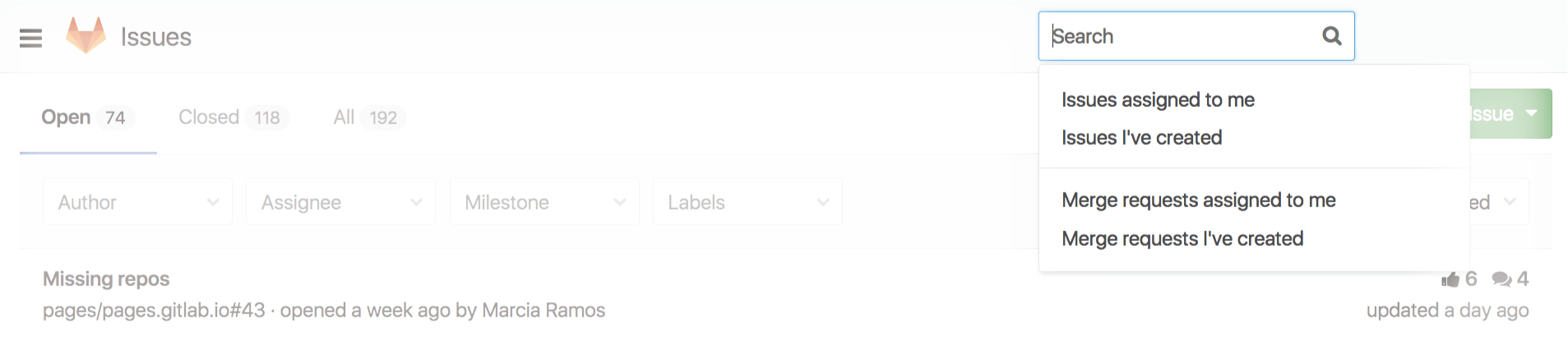 The same process is valid for merge requests. Navigate to your project's Merge Requests tab. The search and filter UI currently uses dropdowns. In a future release, the same dynamic UI as above will be carried over here.